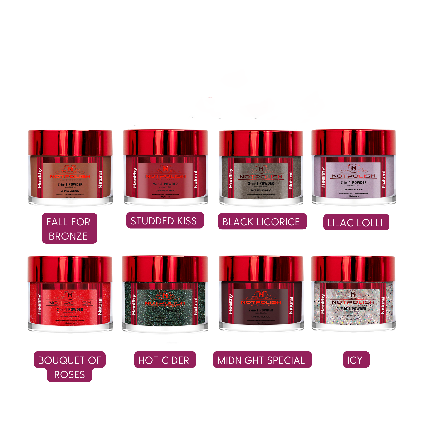 The Femme Fatale Bundle is for the babe who's edgy, sultry and a little risqué. This Bundle features darker, sexier colors from our OG Collection, M Collection, OG Collection, Candy Coated Collection, and OMG Collection. With one look at your nails, everyone will know you're not the babe to mess with. Don't start none, won't be none. ***OMG Glitters come in 1oz onlyFemme Fatale Bundle includes: •Fall for Bronze (M64)•Studded Kiss (OG111)•Black Licorice (CC1002)•Lilac Lolli (CC1010)•Bouquet of Roses (OG127)•Hot Cider (M25)•Midnight Special (OG182)•Icy (OMG11)