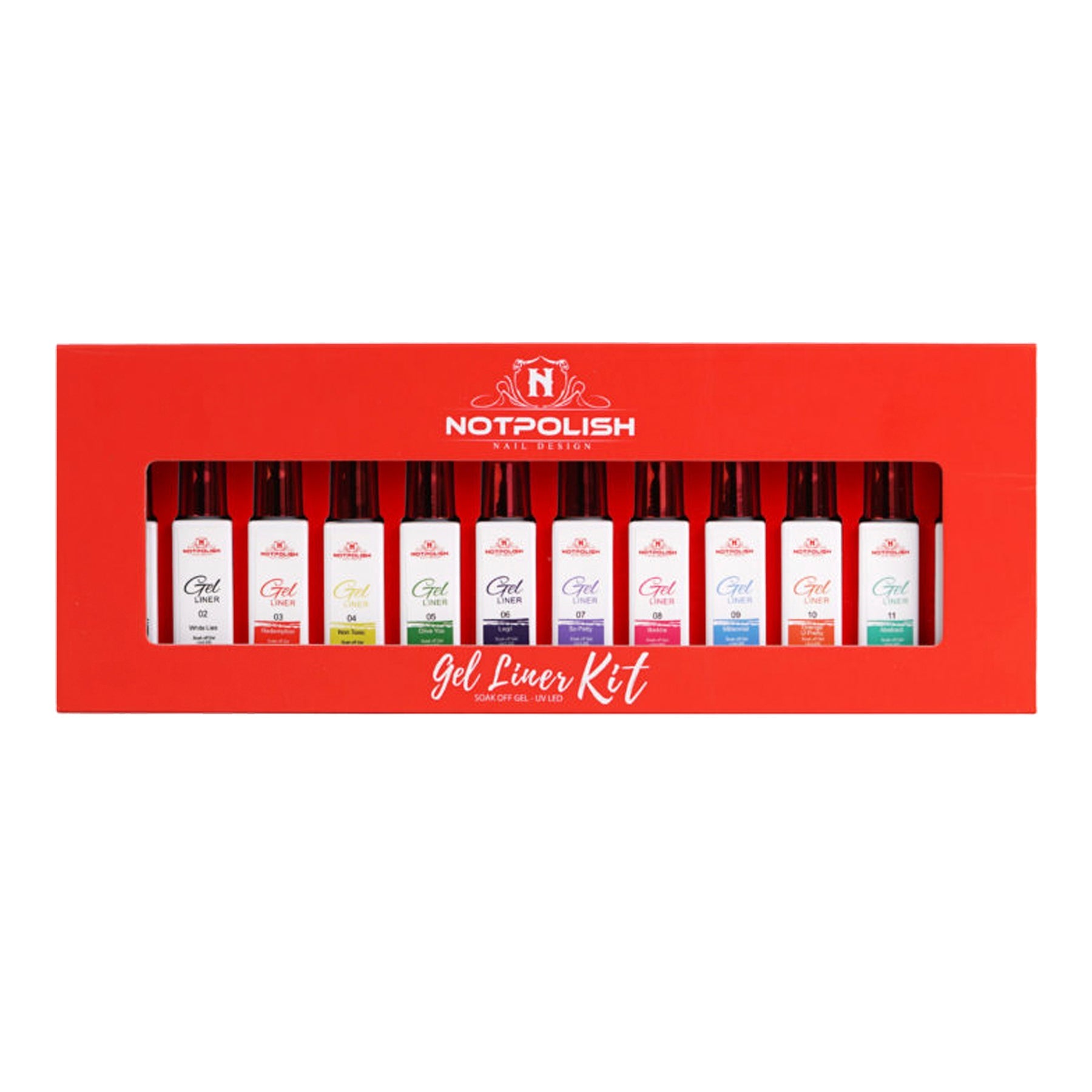 With a little imagination, the possibilities are endless! NotPolish Gel Liner Kit is 12 shades of highly pigmented colors. The applicator brush makes for an effortless look. Within 30 seconds your gel liner cures. So easy to use- these shades can create graphic looks or add a quick pop of color. The thin brush can complete all of your French manicures. The brush is simple to use: gliding top to bottom and left to right for all your designs. These pencil like liners are a must in your collection!