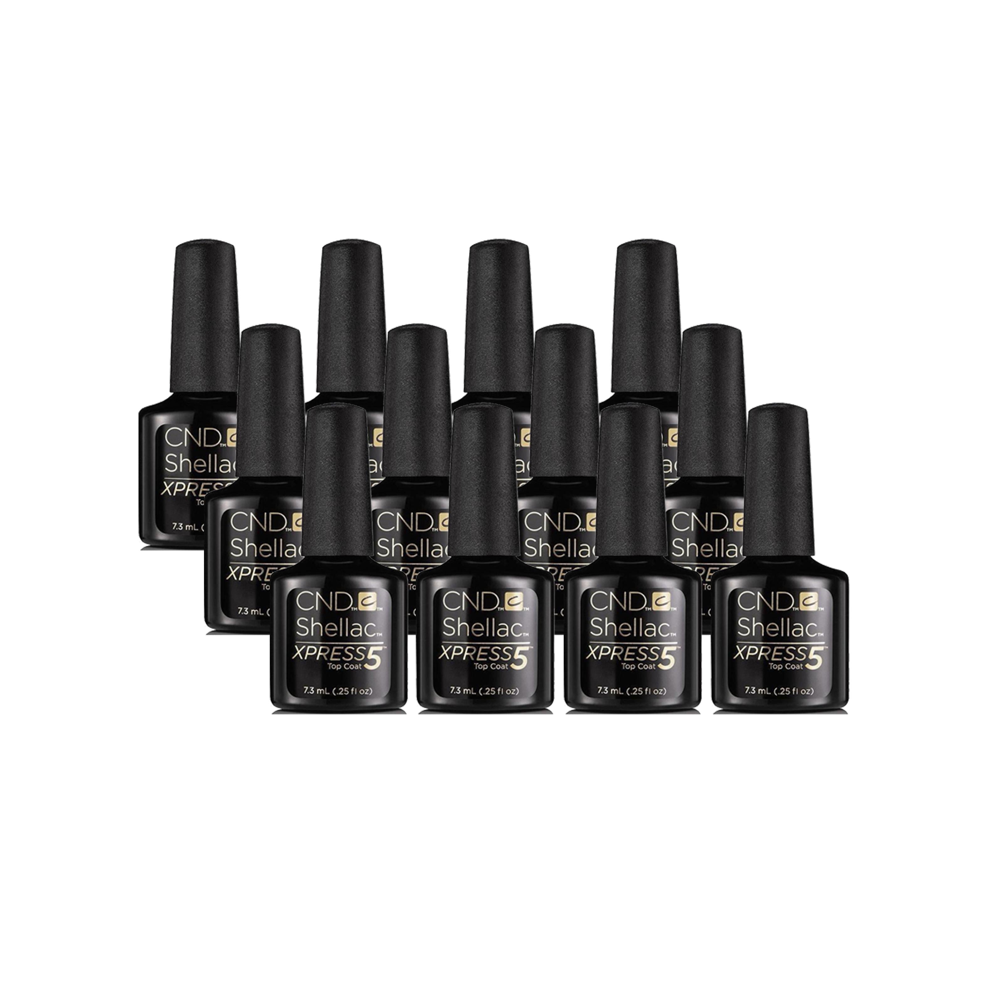 12 Pack of 0.25 oz bottle of CND Shellac XPress5 Top Coat. CND Shellac is a designed with a unique soak off gel polish formula that is currently making it the best selling gel in the world. The Shellac gel will cure beautifully under UV lamps and will last for up to 2 weeks. The perfect mirror finish is gorgeous and will remain chip resistant making it best for manicures.