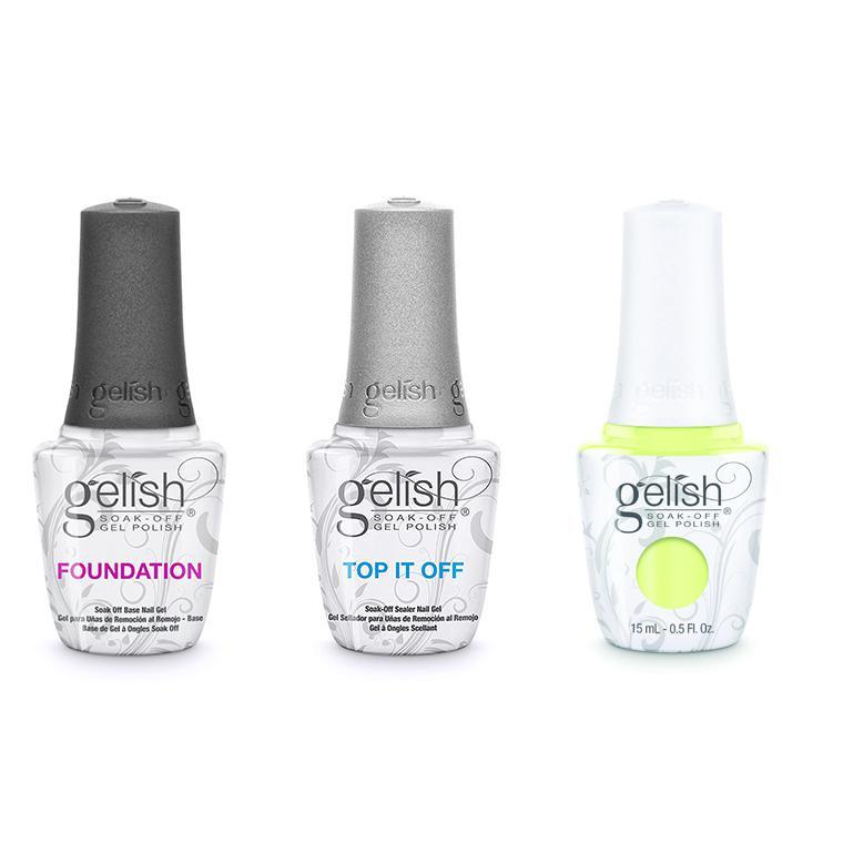 Harmony Gelish Base Coat, Top Coat, and Color Combo. Gelish® Soak-Off Gel Polish applies like polish and cures in a LED lamp in 30 seconds, or 2 minutes in traditional UV lamps. Gelish stays on nails for up to 3 weeks with no chipping or peeling, and soaks completely off in only 10 - 15 minutes. Directions: Gelish® Soak-Off Gel Polish must be cured with LED Light or UV Light system. Apply over Gelish Foundation or Structure Gel. Do NOT apply directly to the natural nail. Must be cured for 30 seconds under LED Light or 2 minutes under UV Light. Apply 2 thin coats and cure between each coat. Seal with Gelish Top IT OFF. Remove with Gelish Artificial Nail Remover.