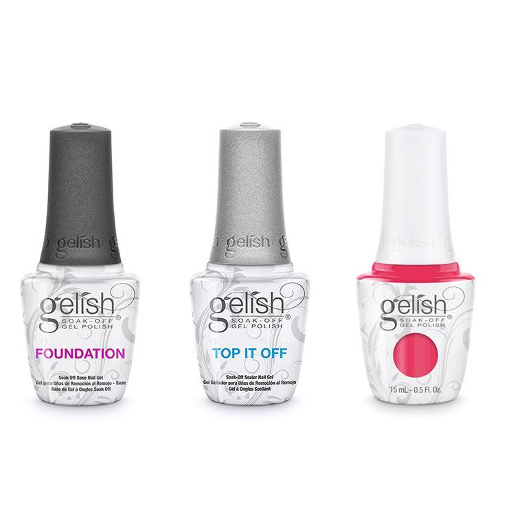 Harmony Gelish Base Coat, Top Coat, and Color Combo. Gelish® Soak-Off Gel Polish applies like polish and cures in a LED lamp in 30 seconds, or 2 minutes in traditional UV lamps. Gelish stays on nails for up to 3 weeks with no chipping or peeling, and soaks completely off in only 10 - 15 minutes. Directions: Gelish® Soak-Off Gel Polish must be cured with LED Light or UV Light system. Apply over Gelish Foundation or Structure Gel. Do NOT apply directly to the natural nail. Must be cured for 30 seconds under LED Light or 2 minutes under UV Light. Apply 2 thin coats and cure between each coat. Seal with Gelish Top IT OFF. Remove with Gelish Artificial Nail Remover.