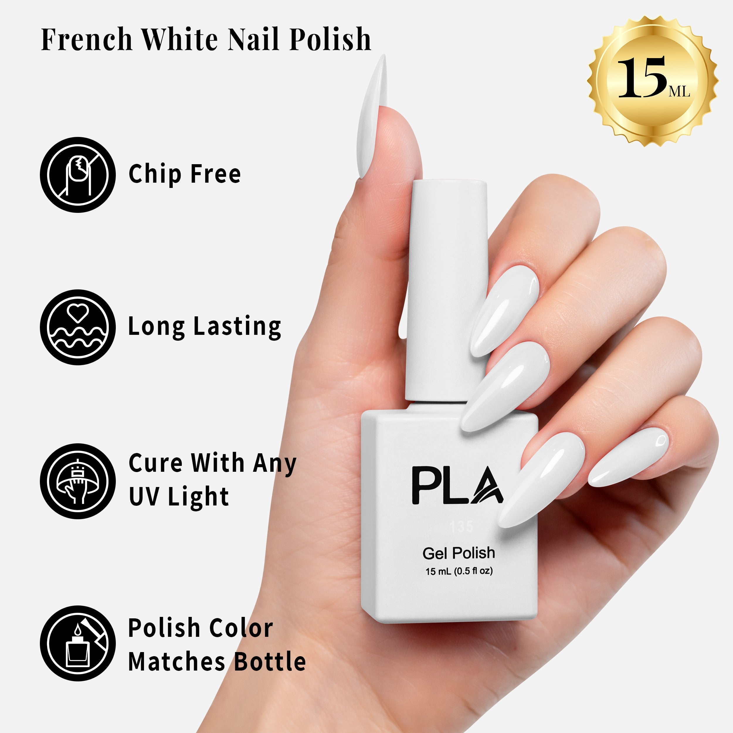 Use the PLA White Gel polish for anything from a subtle, simple white look to a timeless French manicure! For best results, pair with a professional 3-step gel system. After applying the base coat, cure the gel polish under an LED lamp, finishing with the top coat.