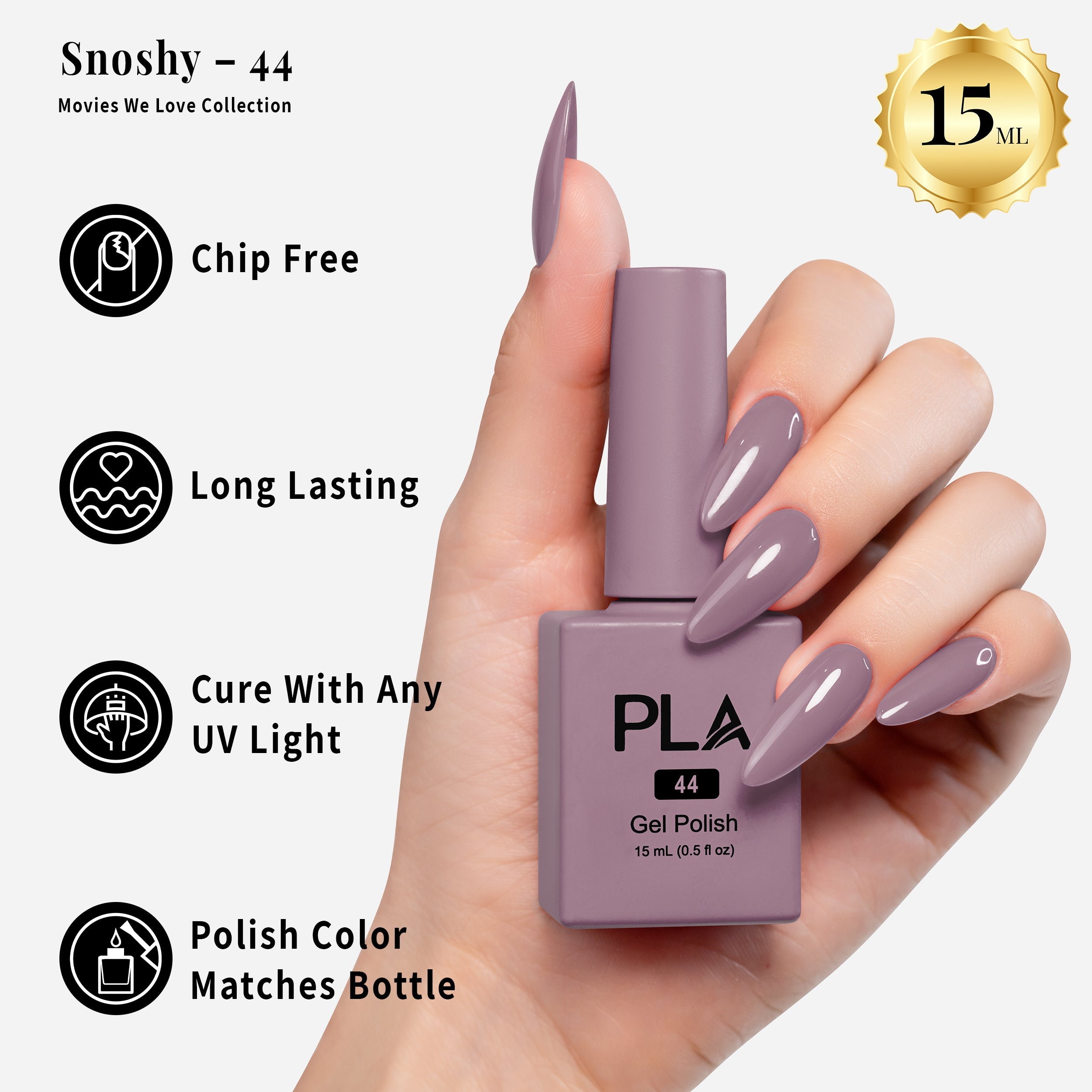 The Movies We Love Nail Collection includes vivid, glossy pinks that can be used for a professional 3-step gel system. After applying the base coat, cure the gel polish under an LED lamp, finishing with the top coat.