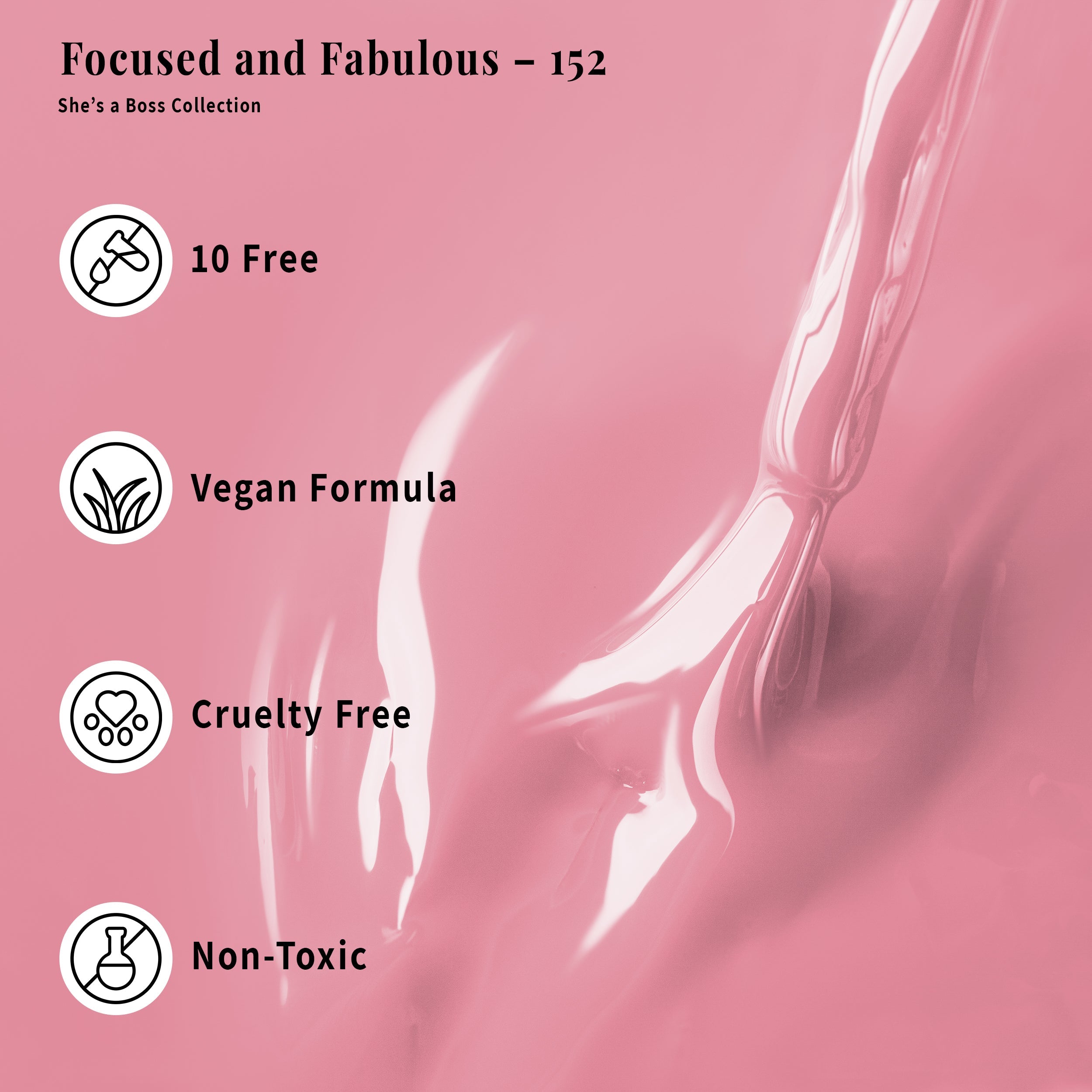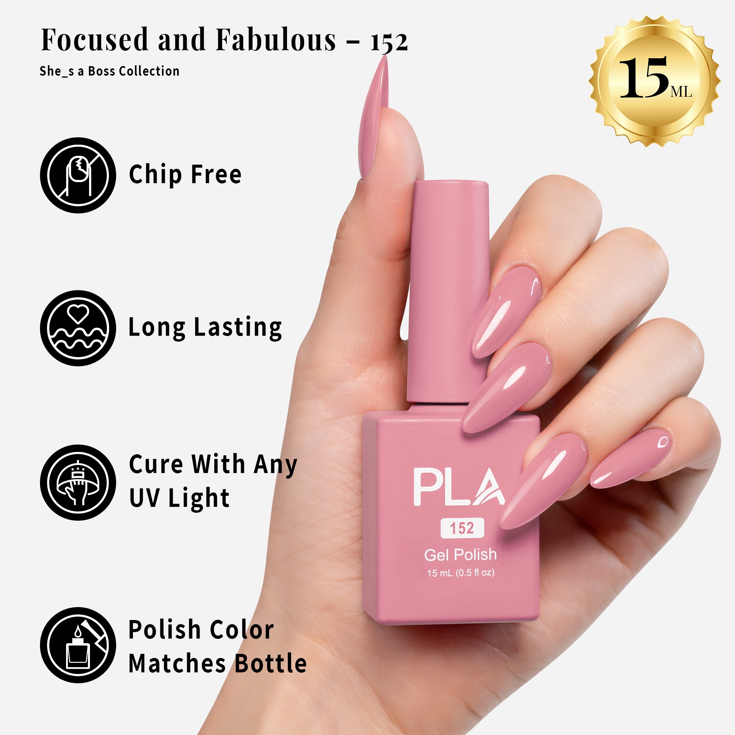 The She's A Boss Collection includes classy, sophisticated shades that can be used for a professional 3-step gel system. After applying the base coat, cure the gel polish under an LED lamp, finishing with the top coat.