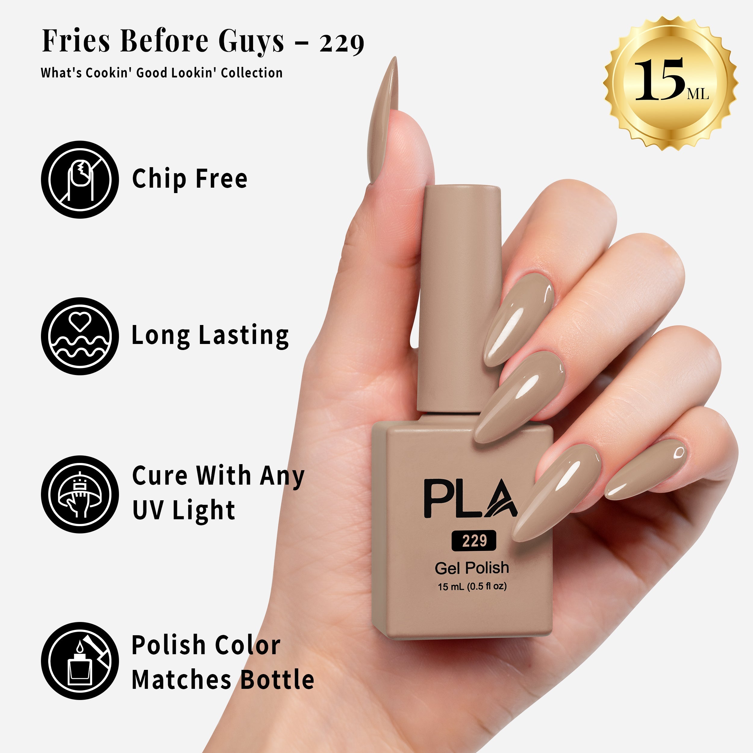 The What's Cookin' Good Lookin' Collection is full of neutral shades that will add a sophisticated, elegant touch to any look and can be used for a professional 3-step gel system. After applying the base coat, cure the gel polish under an LED lamp, finishing with the top coat.