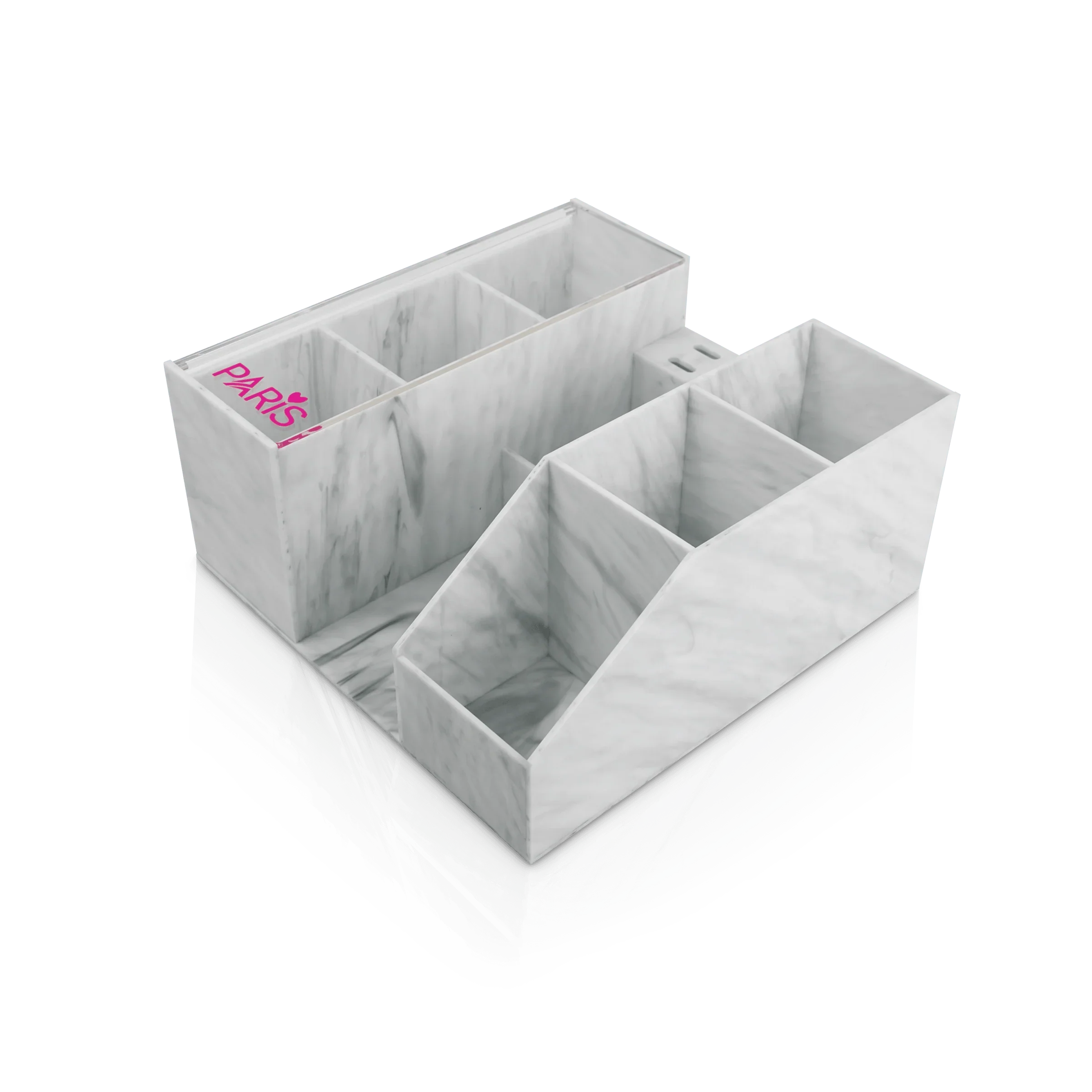 The PLA Marble Lash Organizer is here to help you keep all your supplies organized. Each organizer comes with a section that has a clear top to keep lash brushes and spoolies clear of debris. Stand includes room for 4 pairs of tweezers.