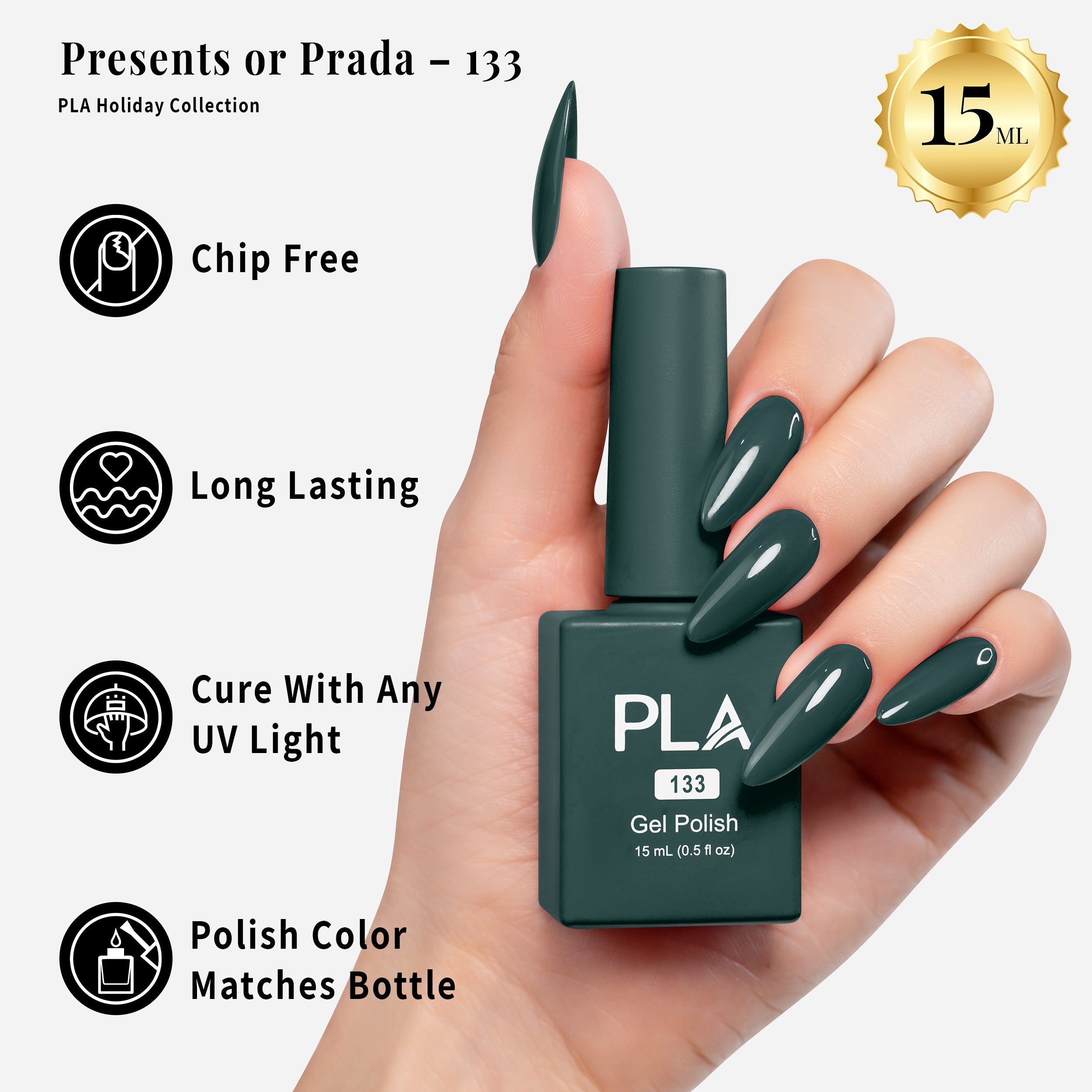 All is merry and bright with The PLA Holiday Collection! This collection offers festive reds, greens, and blues that can be used for a professional 3-step gel system. After applying the base coat, cure the gel polish under an LED lamp, finishing with the top coat.
