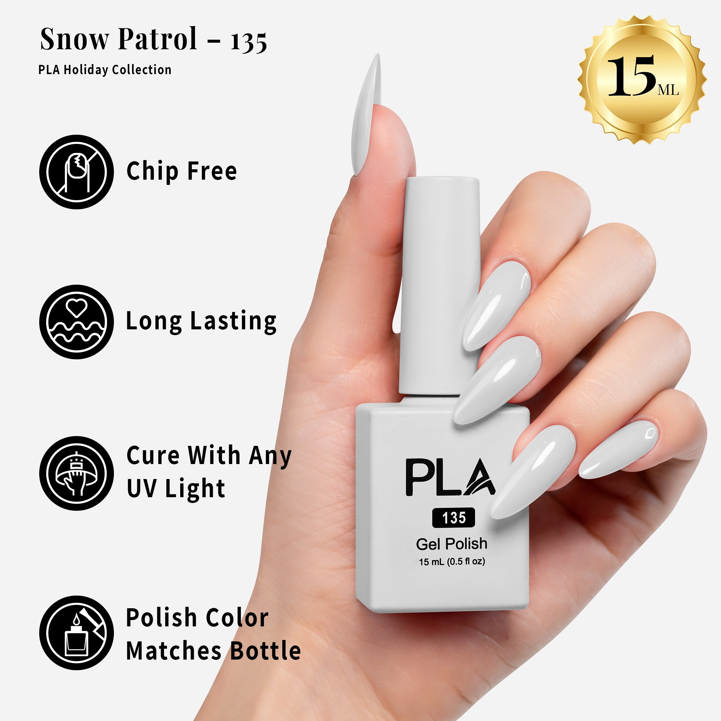 All is merry and bright with The PLA Holiday Collection! This collection offers festive reds, greens, and blues that can be used for a professional 3-step gel system. After applying the base coat, cure the gel polish under an LED lamp, finishing with the top coat.