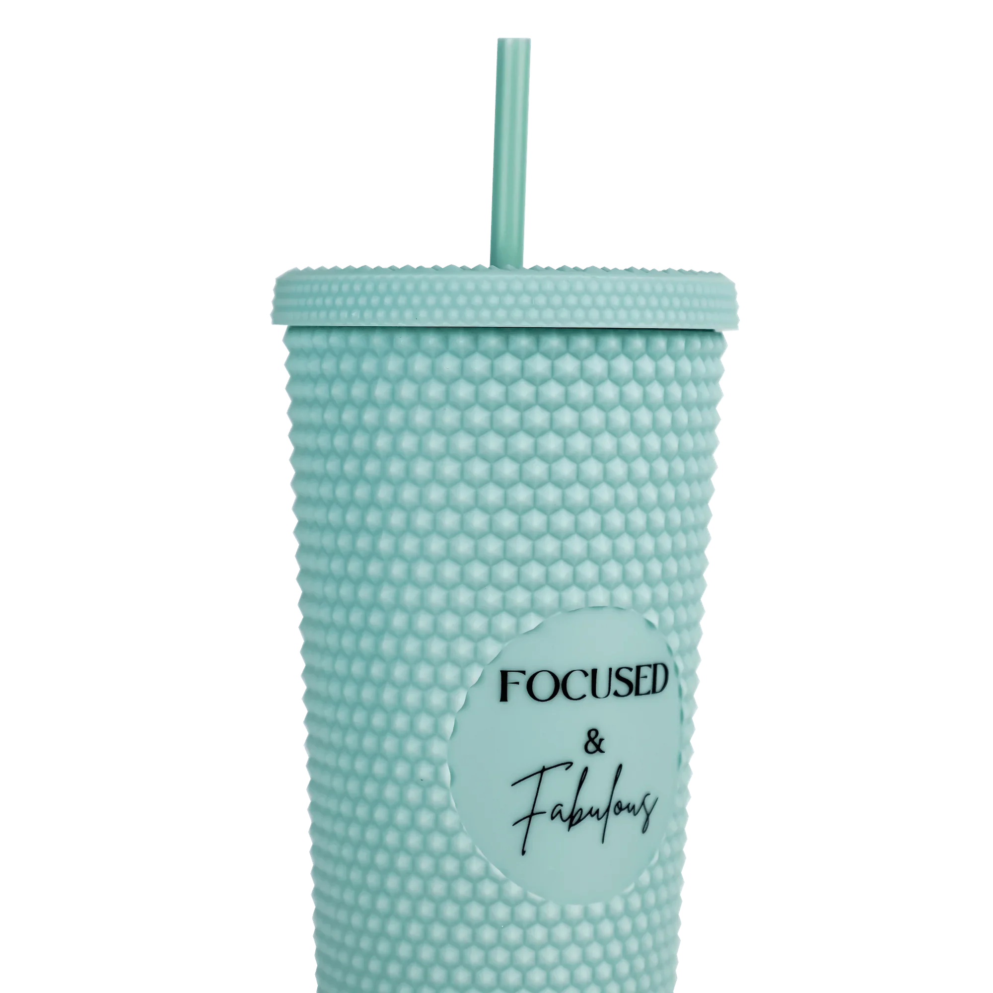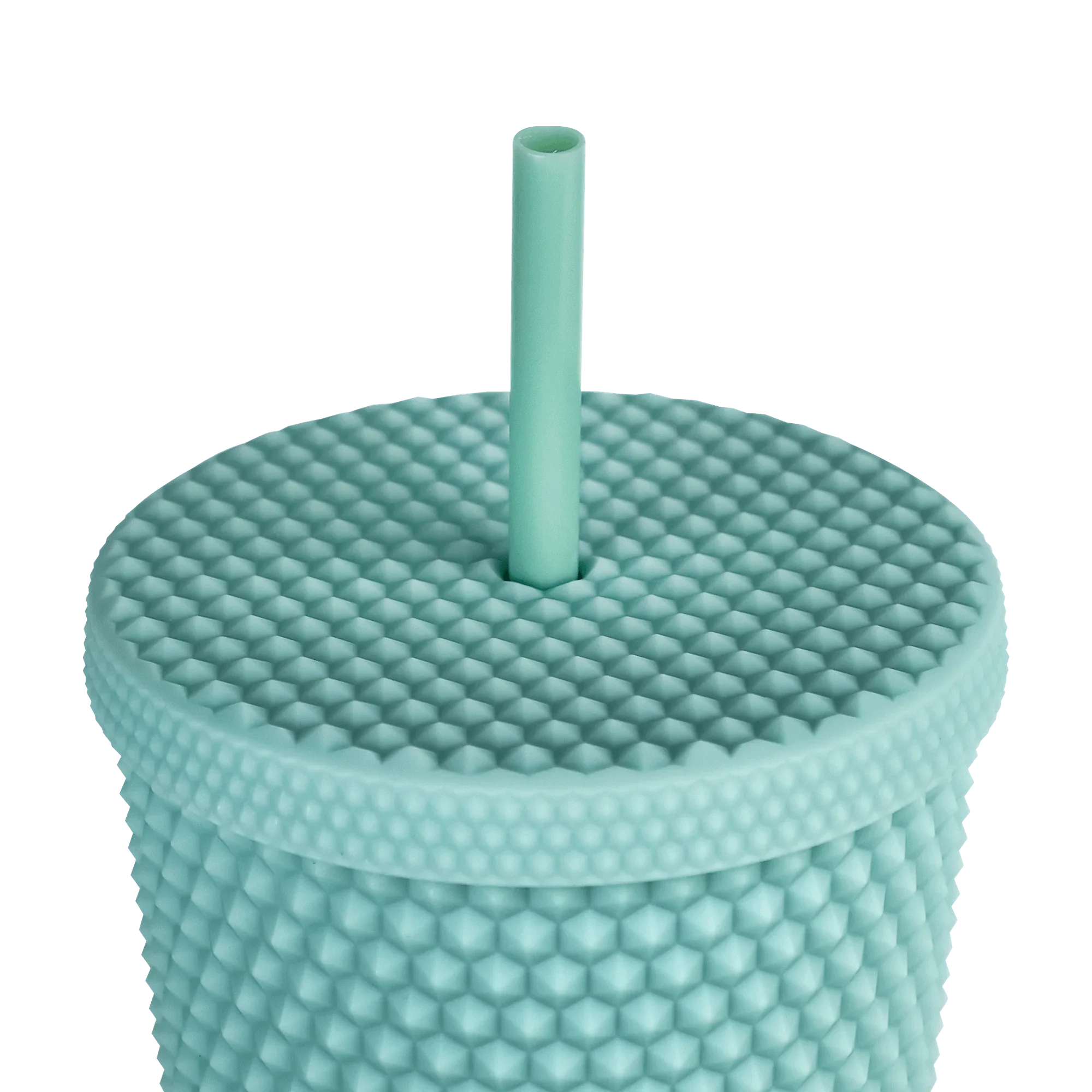 Our Studded Mint Tumbler from PLA is a 24 oz. tumbler with an insulated double wall so your drink will stay cold for hours. The tumbler comes with a screw on lid and a straw. We recommend hand washing only.