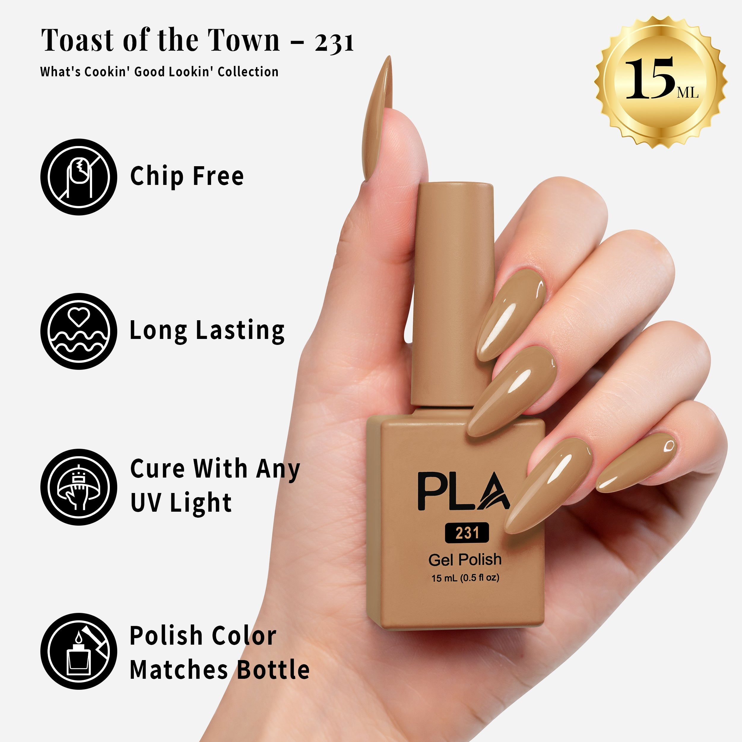 The What's Cookin, Good Lookin Collection is full of neutral shades that will add a sophisticated, elegant touch to any look and can be used for a professional 3-step gel system. After applying the base coat, cure the gel polish under an LED lamp, finishing with the top coat.