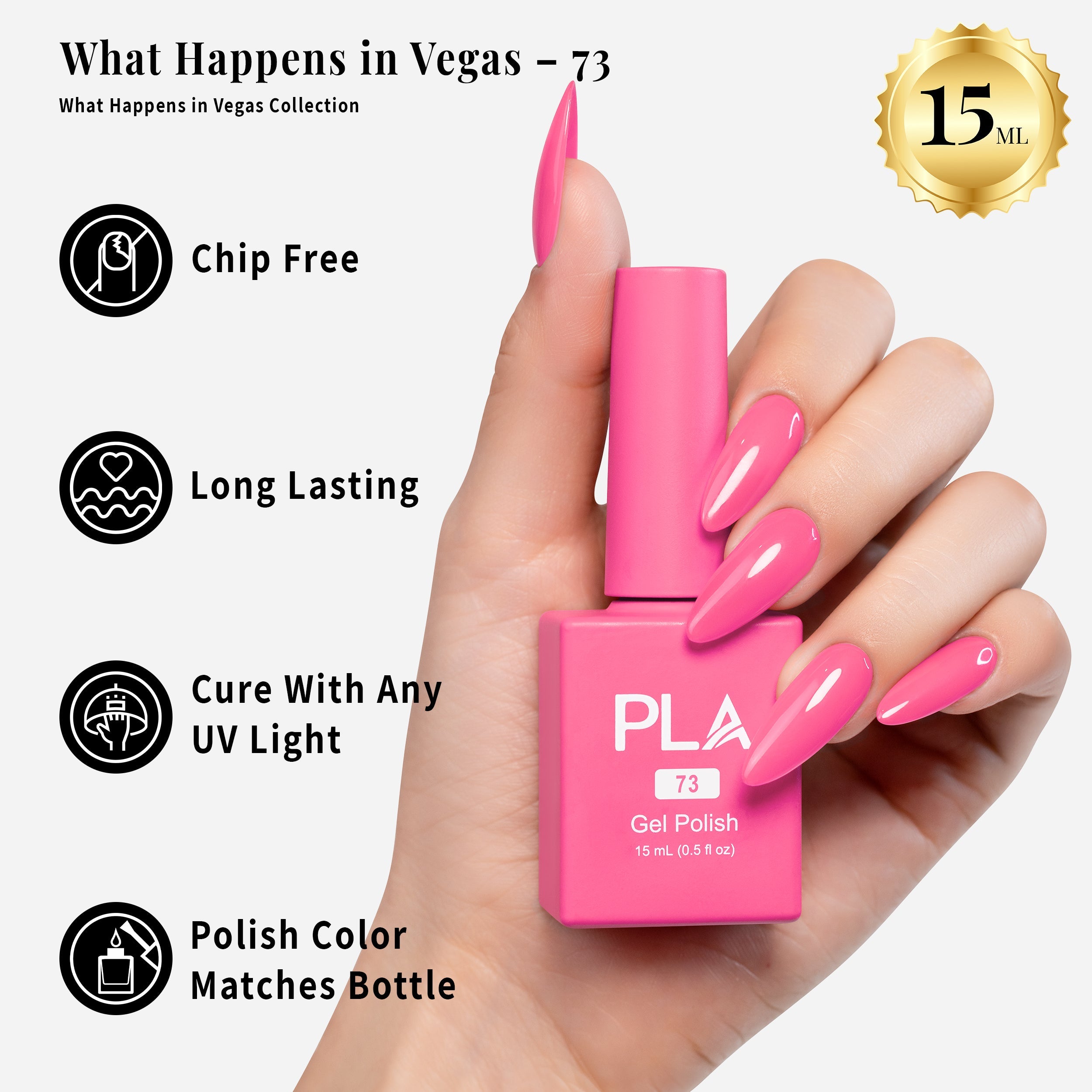 The What Happens in Vegas Collection is full of fun, bright colors that are perfect for a night out on the town and can be used for a professional 3-step gel system. After applying the base coat, cure the gel polish under an LED lamp, finishing with the top coat.